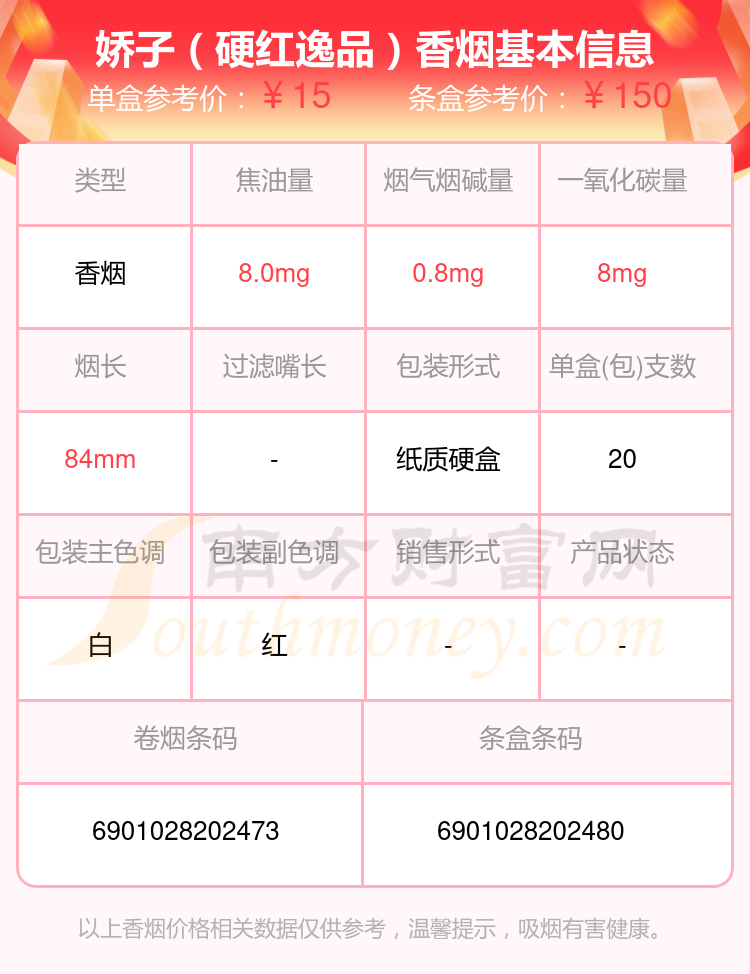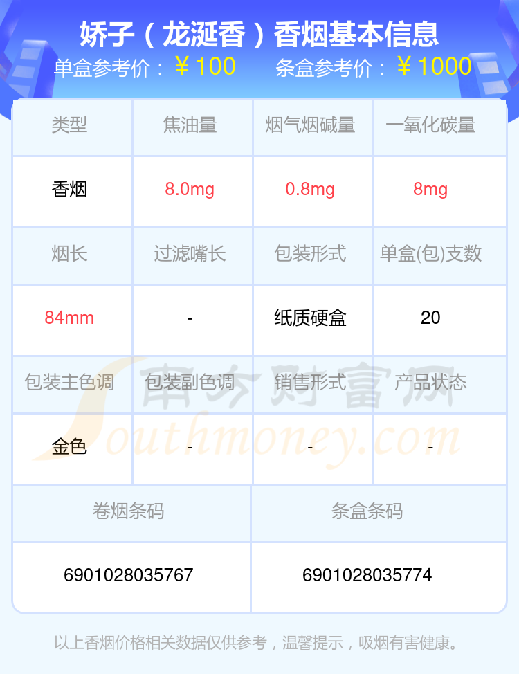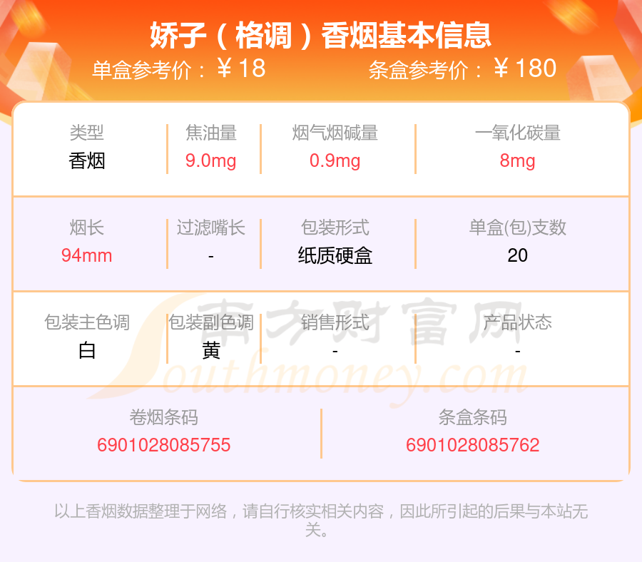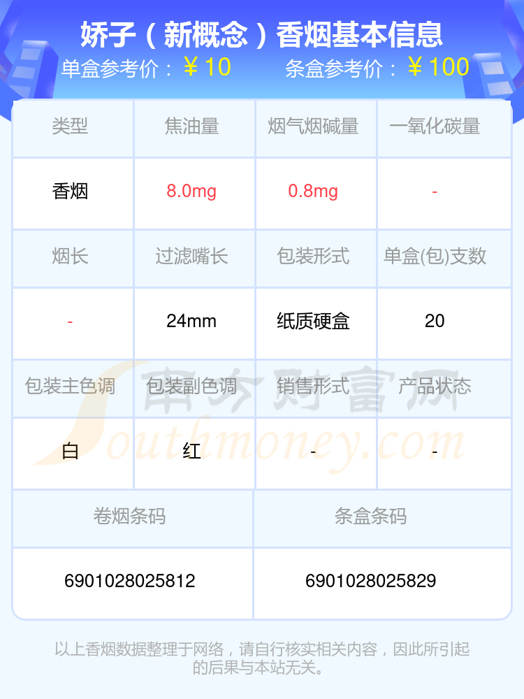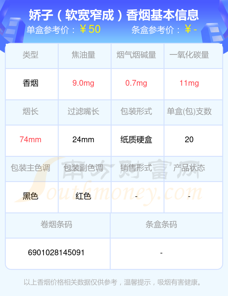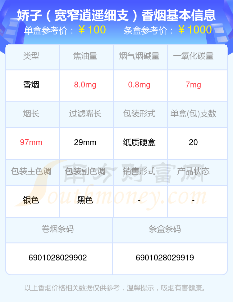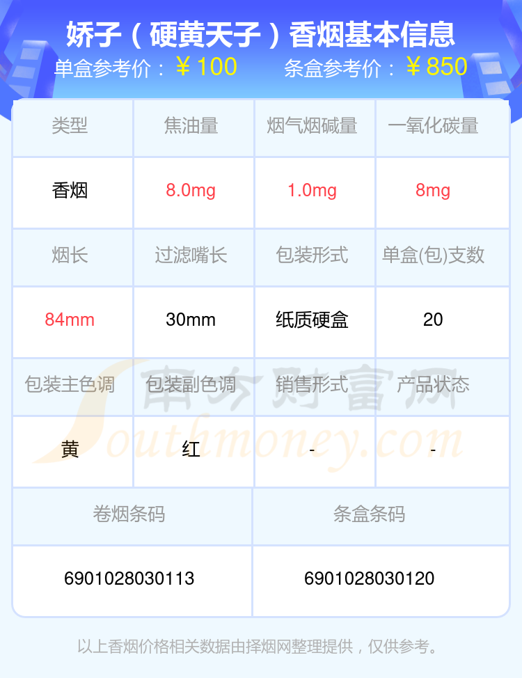 擇煙網為大家盤點了焦油量10mg以下的嬌子香煙,分別有嬌子(寬窄自在)、嬌子(軟寬窄成)、嬌子(格調)、嬌子(硬黃天子)、嬌子(龍涎香)、嬌子(格調細支)、嬌子(新概念)、嬌子(硬紅逸品)、嬌子(寬窄逍遙細支)、嬌子(天之嬌子)等,具體價格如下: