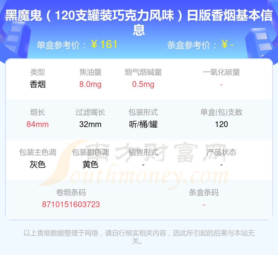 黑魔鬼(椰奶120支罐裝)日版參考價(jià)161.0元/包、黑魔鬼(120支罐裝巧克力風(fēng)味)日版參考價(jià)161.0元/包等。