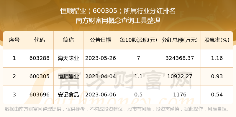 、恒順醋業(yè)600305行業(yè)分紅排名