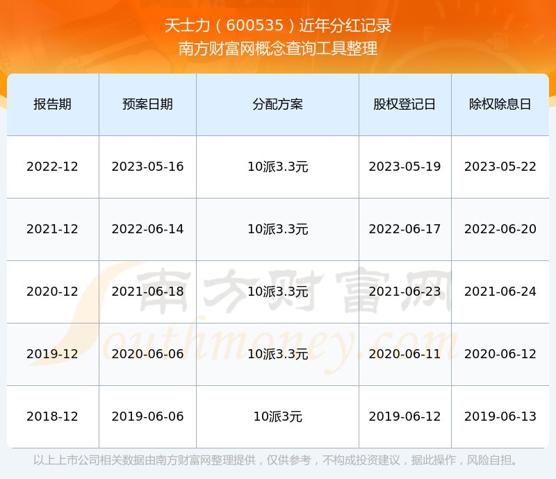 天士力最新一次公布的分紅方案為10派3.3元。本次權(quán)益分派股權(quán)登記日為2023年5月19日,除權(quán)除息日為2023年5月22日,派息日為2023年5月22日。