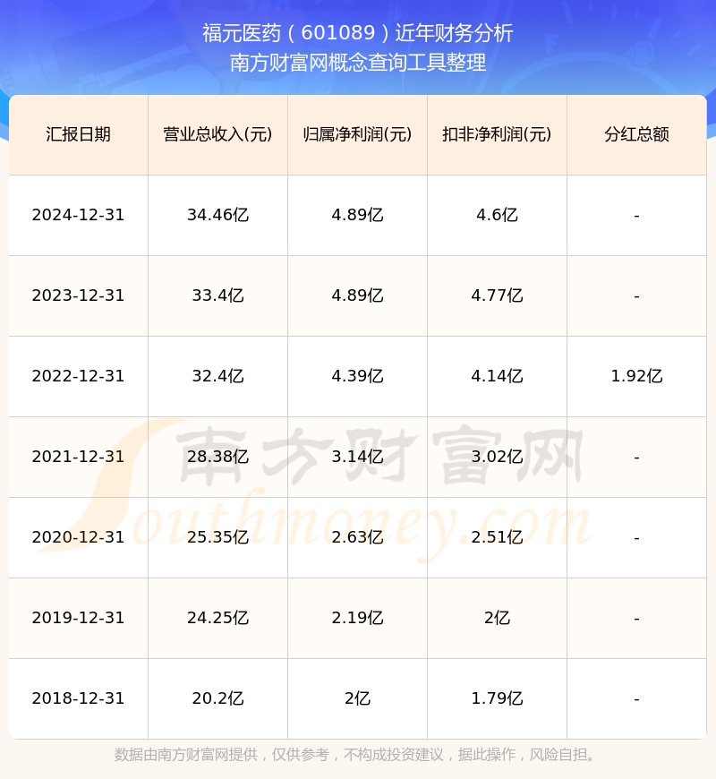 福元醫(yī)藥公司2024年實現(xiàn)營業(yè)收入34.46億元,同比增長3.17%;凈利潤4.89億元,同比增長-0.02%;毛利率67.09%。