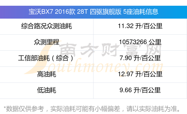 根據(jù)車主實測數(shù)據(jù),該車型低油耗為9.66升/百公里,高油耗為12.97升/百公里,綜合路況眾測油耗為11.32升/百公里,工信部綜合油耗為7.90升/百公里。