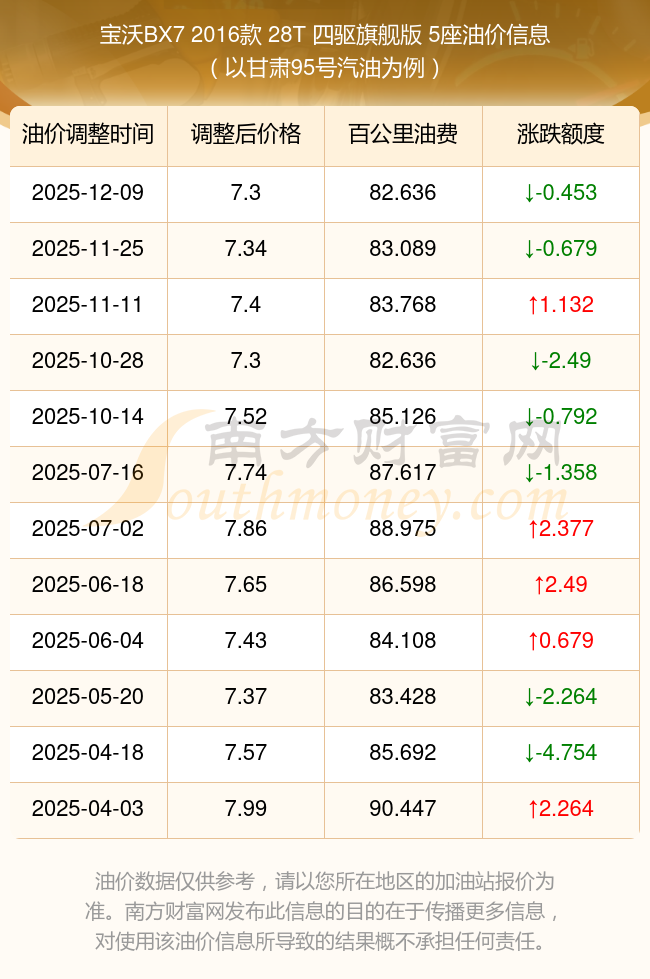 依照12月9日95號汽油最新調(diào)整價格7.3元/升來計算(以甘肅為例),該車型百公里的平均油費是82.636元,依照上一輪11月25日調(diào)整價格7.34元/升來計算,百公里的平均油費是83.089元,對比上一輪少花0.453元,下一輪的油價調(diào)整時間12月22日24時。