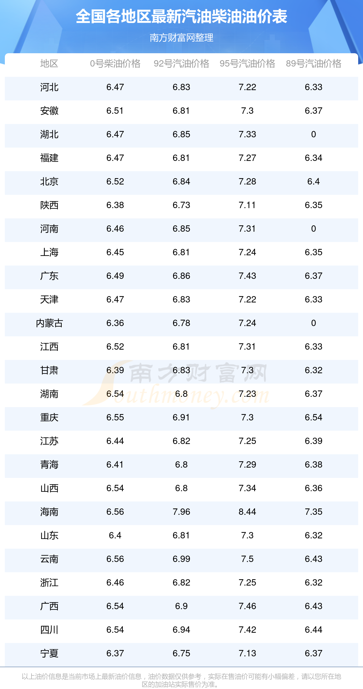 以上油價(jià)信息是當(dāng)前市場(chǎng)上最新油價(jià)信息,油價(jià)數(shù)據(jù)僅供參考,實(shí)際在售油價(jià)可能有小幅偏差,請(qǐng)以您所在地區(qū)的加油站實(shí)際售價(jià)為準(zhǔn)。