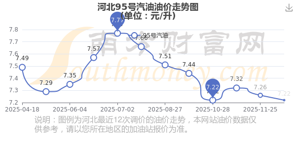 12月14日,河北95號(hào)汽油的價(jià)格是7.22元每升,本次的調(diào)整時(shí)間為12月9日,對(duì)比上次的調(diào)整下降了0.04元,下降0.551%,12月22日24時(shí)為下一輪油價(jià)調(diào)整時(shí)間,還有8.7天。