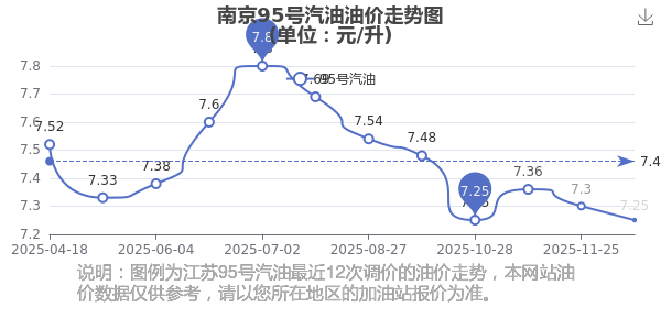 12月14日南京汽油、柴油每升價格:距離最近的油價調(diào)整時間是12月9日,92號汽油為6.82元,下降了0.04元,下降幅達(dá)0.58%;95號汽油為7.25元,下降了0.05元,下降幅達(dá)0.69%;89號汽油為6.39元,下降了0.04元,下降幅達(dá)0.62%;0號柴油為6.44元,下降了0.05元,下降幅達(dá)0.77%。南京下一輪油價調(diào)整時間12月22日24時,距離現(xiàn)在還有8.69天。