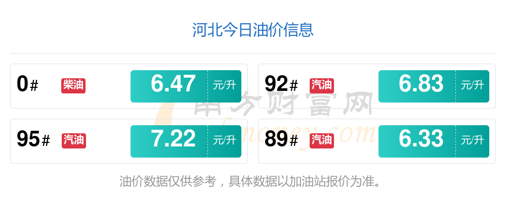 油價(jià)數(shù)據(jù)僅供參考,請以您所在地區(qū)的加油站報(bào)價(jià)為準(zhǔn)。南方財(cái)富網(wǎng)發(fā)布此信息的目的在于傳播更多信息,對使用該油價(jià)信息所導(dǎo)致的結(jié)果概不承擔(dān)任何責(zé)任。