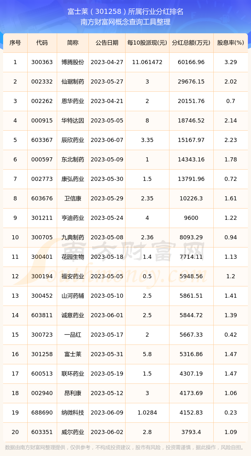 按照南方財富網(wǎng)趨勢選股系統(tǒng)統(tǒng)計,富士萊所屬行業(yè)為化學(xué)制藥行業(yè),化學(xué)制藥行業(yè)分紅排名情況如下表: